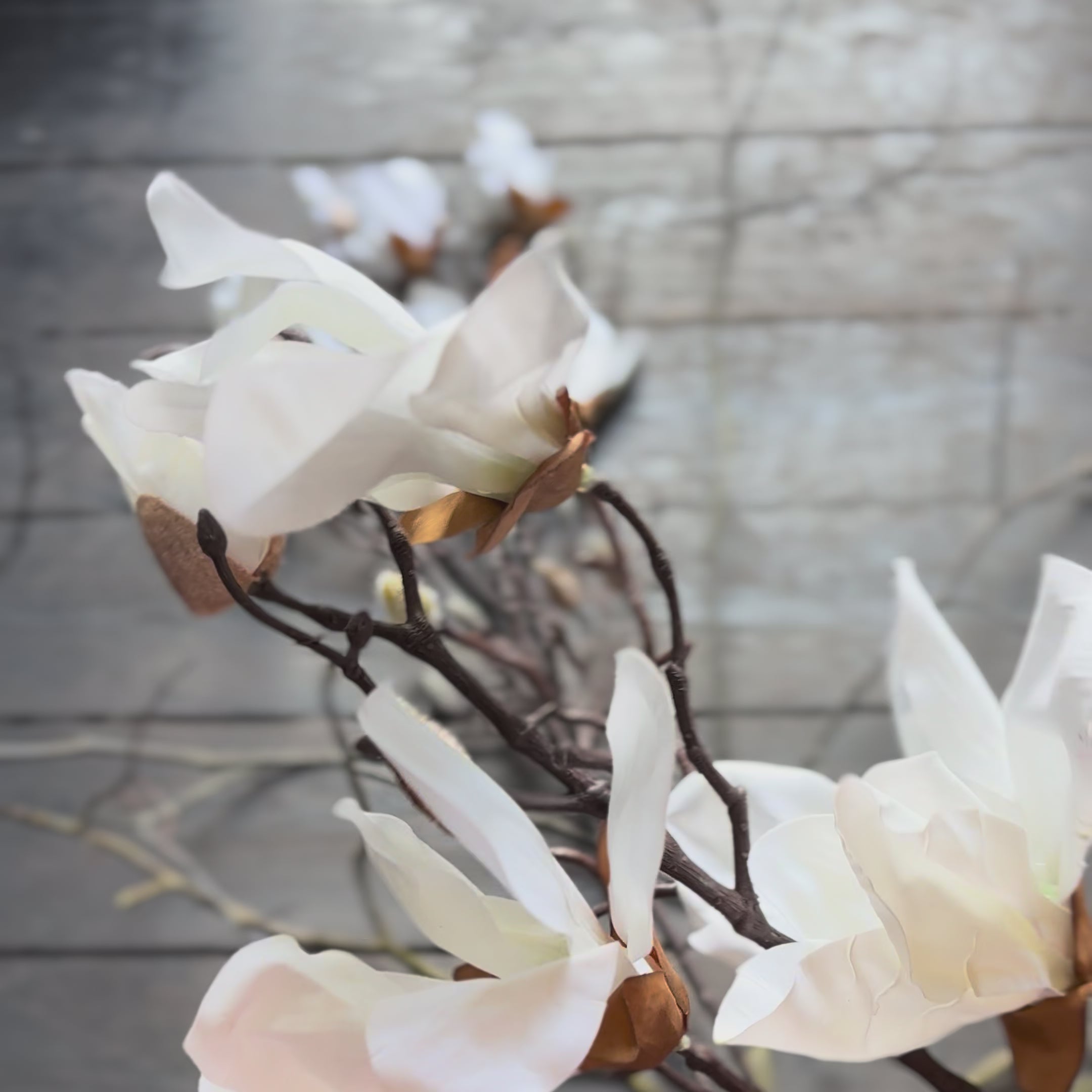 These beautiful artificial magnolia stems feature soft blossoms delicately dotted along naturalistic branches for a remarkably realistic look. This elegant faux magnolia spray adds height and architectural interest to vases and floral arrangements. Pair with twiggy stems or pussy willow for a timeless spring display.